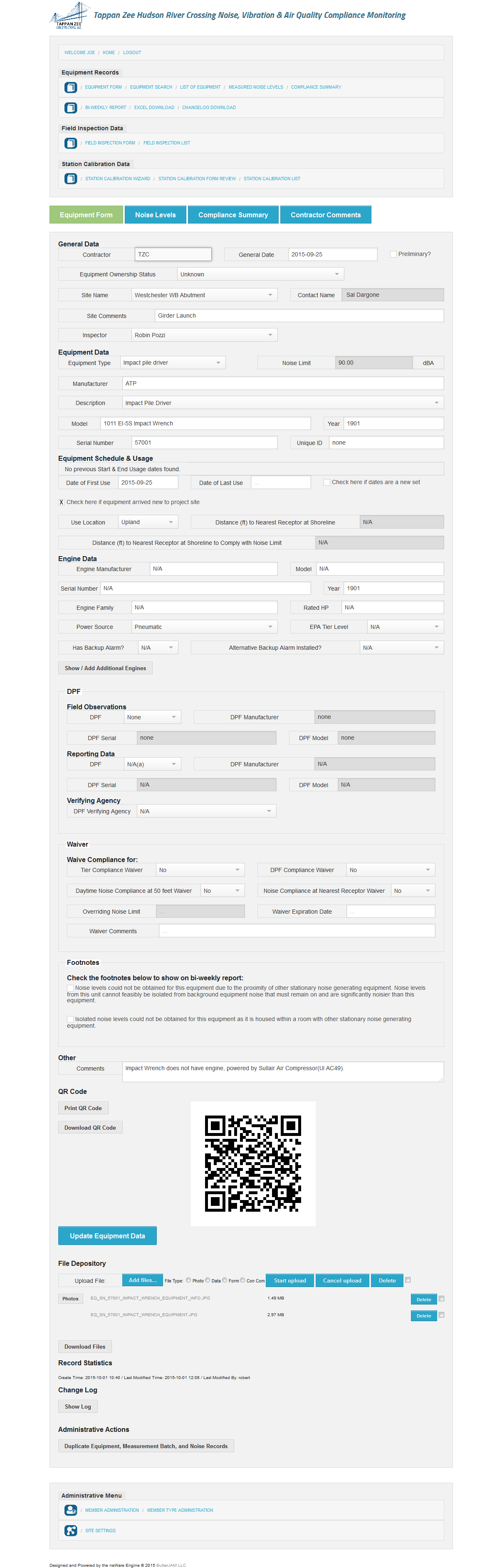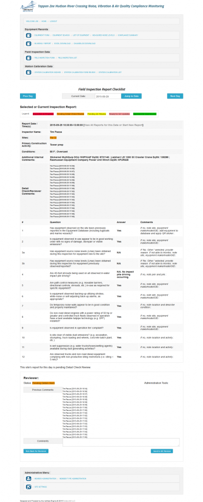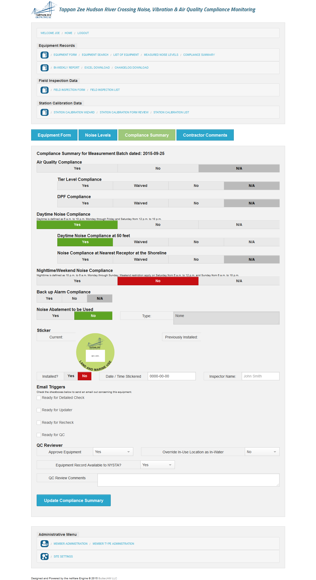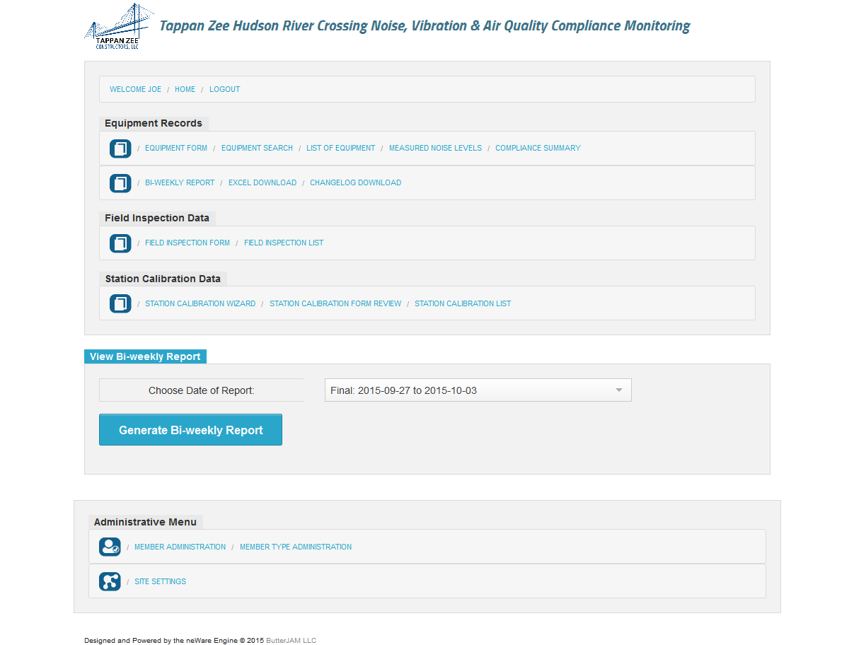 ButterJAM was contracted by the Tappan Zee Hudson River Crossing Bridge Replacement project to create various online and mobile database monitoring systems for the $3.142 billion dollar 5-year capital construction project. They include Equipment Source Monitoring, Station Calibration Monitoring, Field Inspection Reporting, Visual Water Quality Monitoring, and Environmental Alert Monitoring. Each of the systems include custom designed database tools used by the project management teams to assist in the numerous complex aspects of the construction endeavor. The database systems are equipped with comprehensive reporting modules, automated alerts, data entry wizards for online and mobile data input, file management tools, user logging, and automated backup routines. The systems automate hundreds of compliance rules, exceptions, and waivers that is required to minimize environmental impact from the construction. The systems are supported with hundreds of automated scripts that ingest, process, maintain, and report on the millions of records that span the massive databases.