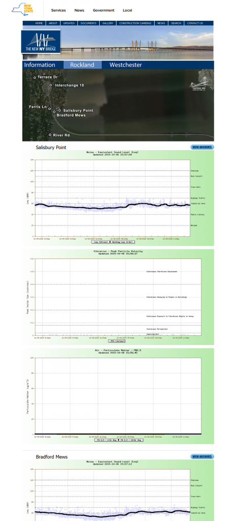 ButterJAM was contracted by the Tappan Zee Hudson River Crossing Bridge Replacement project to create a real-time environmental reporting system for the $3.142 billion dollar 5-year capital construction project. The system ingests live data from 32 noise, vibration, and air quality monitors placed throughout the construction site and processes the raw data into client specified custom graphs that are subsequently made available immediately on the public-facing construction website. Per the project specifications, the system provides a graph update for each of the 32 monitors every minute. The system also generates daily archived images for each of the monitors, documenting the 24 hour span. Generated data and files are automatically replicated and backed up to various project sites for disaster recovery purposes.