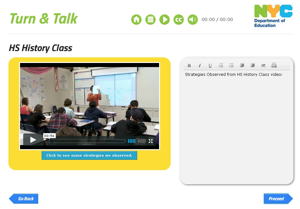 The New York City Department of Education contracted ButterJAM to create a learning module for their Aris platform on the subject of Turn and Talk. The learning module was created as an interactive multimedia presentation learning tool. The module was created with features such as voice-overs synced with close-captions, retention of user-generated content, user-driven presentation speeds, embedded video and audio, and interactive questions and answers. The design was implemented to present the material with simplicity and clarity while remaining engaging with the latest responsive technology to accommodate any device, whether it is viewed from a desktop, laptop, mobile, or tablet.