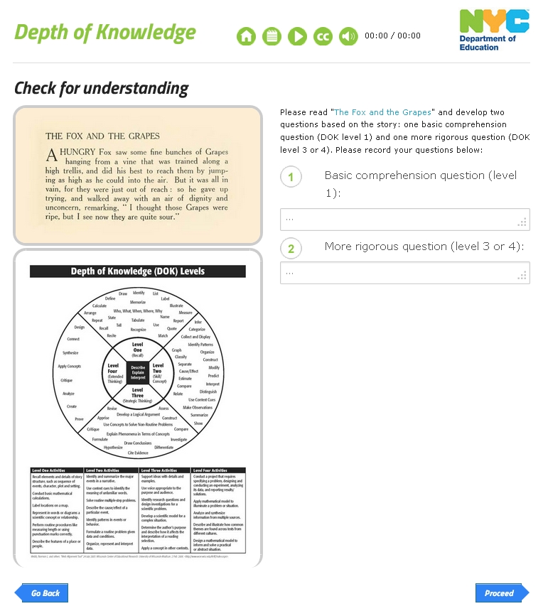 The New York City Department of Education contracted ButterJAM to create a learning module for their Aris platform on the subject of Depth of Knowledge. The learning module was created as an interactive multimedia presentation learning tool. The module was created with features such as voice-overs synced with close-captions, retention of user-generated content, user-driven presentation speeds, embedded video and audio, and interactive questions and answers. The design was implemented to present the material with simplicity and clarity while remaining engaging with the latest responsive technology to accommodate any device, whether it is viewed from a desktop, laptop, mobile, or tablet.