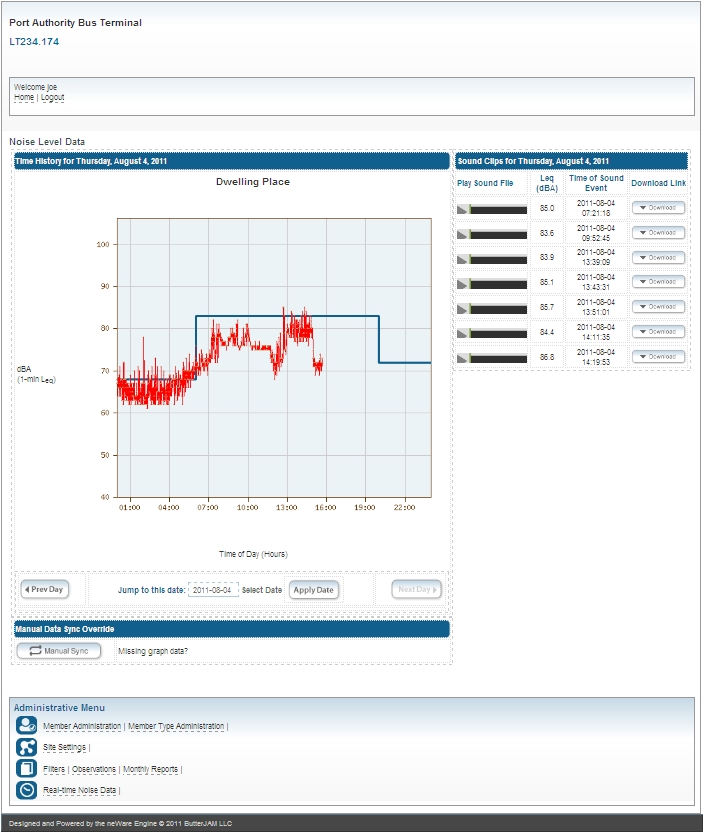 Paul Carpenter Associates contacted ButterJAM to create a system to serve as an online live monitor of the Port Authority of NY/NJ Bus Terminal on 8th and 42nd street. The system is to monitor and track the Noise Environmental Performance Commitments (EPCs) continuously. The customized system is based off ButterJAM’s proprietary neWare content management engine. The system takes live noise data generated from monitors placed onsite and processes the raw data into charts, interactive graphs, and audio playback as specified by the client. Alerts are automatically generated via email in instances of potential noise exceedance as well as service interruption at the busy bus terminal site. Monthly PDF reports are generated with statistical data showing an overview of the month’s data in a easy-to-read tabular format. ButterJAM’s system processes and stores over 80,000 new data records daily and 100MB of new data every week with 2GB of weekly traffic and over 10 online users.